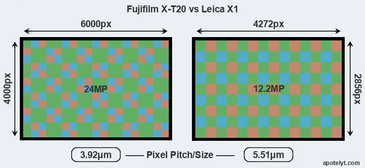 Despite having a slightly smaller sensor, the Fujifilm X-T20 offers a higher resolution of 24 megapixels, compared with 12.2 MP of the Leica X1. This megapixels advantage comes at the cost of a higher pixel density and a smaller size of the individual pixel (with a pixel pitch of 3.92μm versus 5.51μm for the X1). However, it should be noted that the X-T20 is much more recent (by 7 years and 4 months) than the X1, and its sensor will have benefitted from technological advances during this time that make it possible to gather light more efficiently. Coming back to sensor resolution, it should be mentioned that the X-T20 has no anti-alias filter installed, so that it can capture all the detail its sensor resolves.
