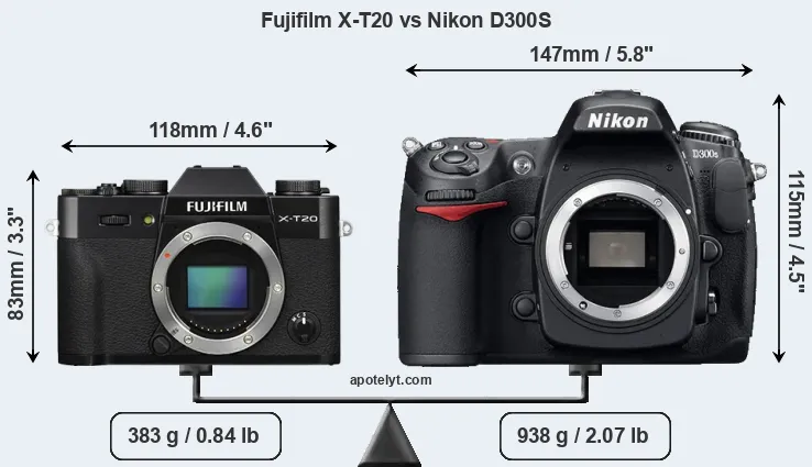If the front view area (width x height) of the cameras is taken as an aggregate measure of their size, the Nikon D300S is considerably larger (73 percent) than the Fujifilm X-T20. Moreover, the D300S is substantially heavier (145 percent) than the X-T20. It is noteworthy in this context that the D300S is splash and dust-proof, while the X-T20 does not feature any corresponding weather-sealing.