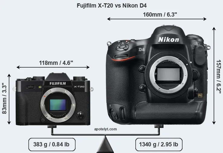 If the front view area (width x height) of the cameras is taken as an aggregate measure of their size, the Nikon D4 is considerably larger (156 percent) than the Fujifilm X-T20. Moreover, the D4 is substantially heavier (250 percent) than the X-T20. It is noteworthy in this context that the D4 is splash and dust-proof, while the X-T20 does not feature any corresponding weather-sealing.