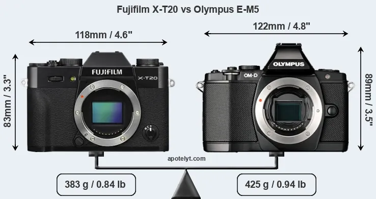 If the front view area (width x height) of the cameras is taken as an aggregate measure of their size, the Olympus E-M5 is notably larger (11 percent) than the Fujifilm X-T20. Moreover, the E-M5 is markedly heavier (11 percent) than the X-T20. It is noteworthy in this context that the E-M5 is splash and dust-proof, while the X-T20 does not feature any corresponding weather-sealing.