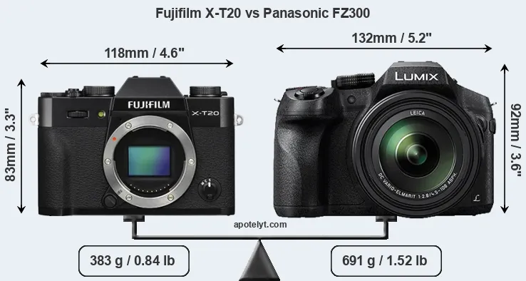 The physical size and weight of the Fujifilm X-T20 and the Panasonic FZ300 are illustrated in the side-by-side display below. The two cameras are presented according to their relative size. Three successive views from the front, the top, and the rear are shown. All width, height and depth measures are rounded to the nearest millimeter.