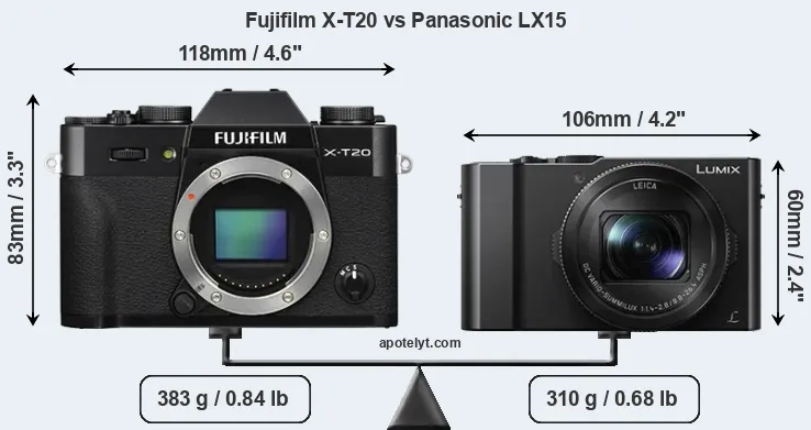 An illustration of the physical size and weight of the Fujifilm X-T20 and the Panasonic LX15 is provided in the side-by-side display below. The two cameras are presented according to their relative size. Three consecutive perspectives from the front, the top, and the back are available. All width, height and depth measures are rounded to the nearest millimeter.