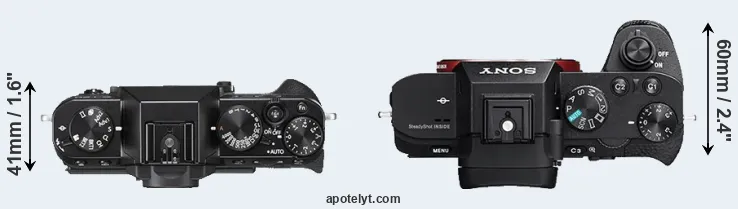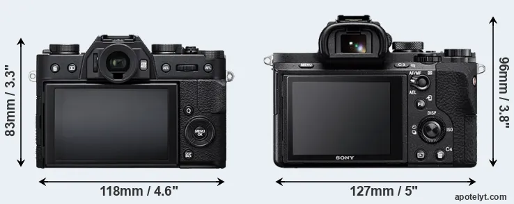 The physical size and weight of the Fujifilm X-T20 and the Sony A7 II are illustrated in the side-by-side display below. The two cameras are presented according to their relative size. Three consecutive views from the front, the top, and the rear side are shown. All width, height and depth measures are rounded to the nearest millimeter.
