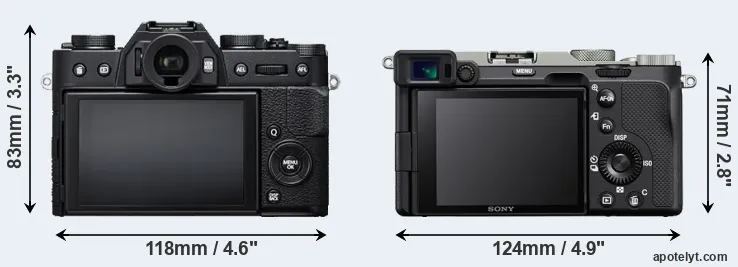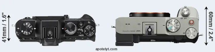 The physical size and weight of the Fujifilm X-T20 and the Sony A7C are illustrated in the side-by-side display below. The two cameras are presented according to their relative size. Three successive views from the front, the top, and the rear are shown. All width, height and depth measures are rounded to the nearest millimeter.