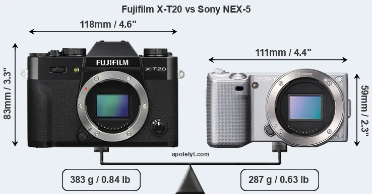 If the front view area (width x height) of the cameras is taken as an aggregate measure of their size, the Sony NEX-5 is considerably smaller (33 percent) than the Fujifilm X-T20. Moreover, the NEX-5 is markedly lighter (25 percent) than the X-T20. In this context, it is worth noting that neither the X-T20 nor the NEX-5 are weather-sealed.