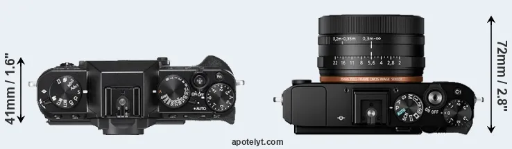 The physical size and weight of the Fujifilm X-T20 and the Sony RX1R II are illustrated in the side-by-side display below. The two cameras are presented according to their relative size. Three consecutive perspectives from the front, the top, and the back are available. All width, height and depth measures are rounded to the nearest millimeter.