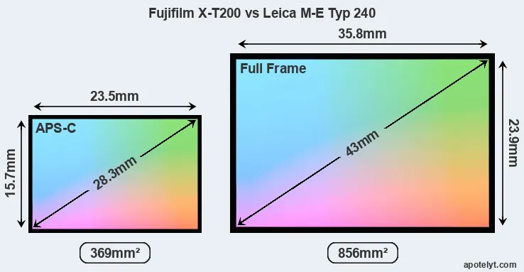 Of the two cameras under consideration, the Fujifilm X-T200 features an APS-C sensor and the Leica M-E Typ 240 a full frame sensor. The sensor area in the M-E Typ 240 is 132 percent bigger. As a result of these sensor size differences, the cameras have a format factor of, respectively, 1.5 and 1.0. Both cameras have a native aspect ratio (sensor width to sensor height) of 3:2.