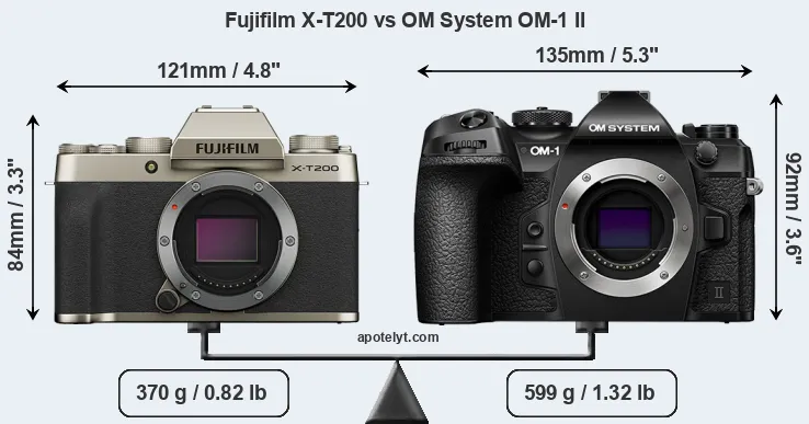 If the front view area (width x height) of the cameras is taken as an aggregate measure of their size, the OM System OM-1 II is notably larger (22 percent) than the Fujifilm X-T200. Moreover, the OM-1 II is substantially heavier (62 percent) than the X-T200. It is noteworthy in this context that the OM-1 II is splash and dust-proof, while the X-T200 does not feature any corresponding weather-sealing.