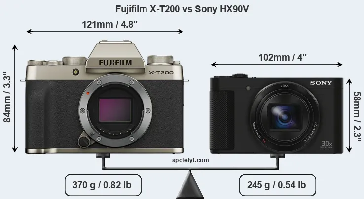 An illustration of the physical size and weight of the Fujifilm X-T200 and the Sony HX90V is provided in the side-by-side display below. The two cameras are presented according to their relative size. Three successive views from the front, the top, and the rear are shown. All size dimensions are rounded to the nearest millimeter.