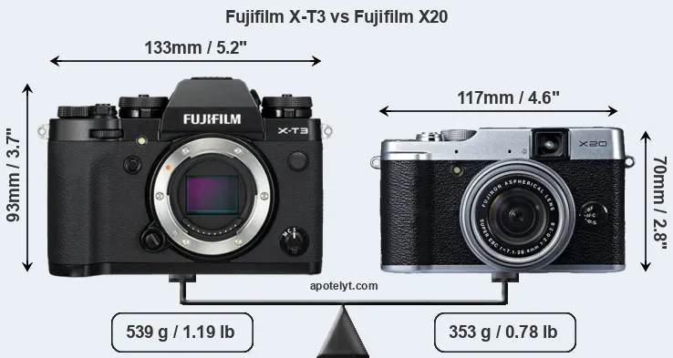 The above size and weight comparisons are to some extent incomplete and possibly misleading, as the X20 has a lens built in, whereas the X-T3 is an interchangeable lens camera that requires a separate lens. Attaching the latter will add extra weight and bulk to the setup. You can compare the optics available for the X-T3 and their specifications in the Fujinon X Lens Catalog.