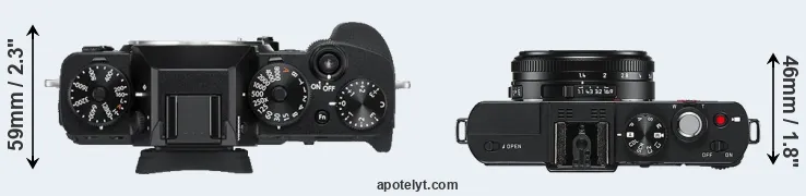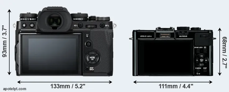 If the front view area (width x height) of the cameras is taken as an aggregate measure of their size, the Leica D-LUX 6 is considerably smaller (39 percent) than the Fujifilm X-T3. It is worth mentioning in this context that the X-T3 is splash and dust resistant, while the D-LUX 6 does not feature any corresponding weather-sealing.