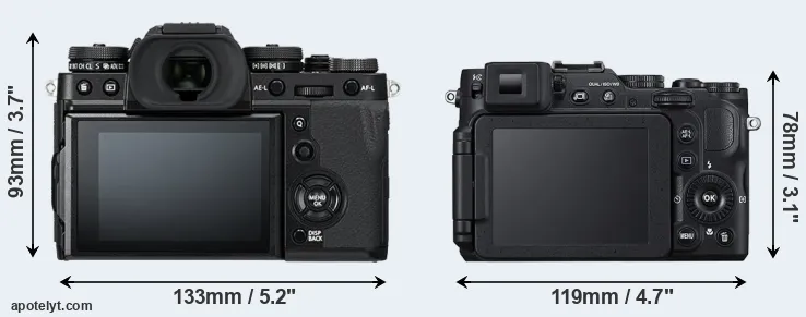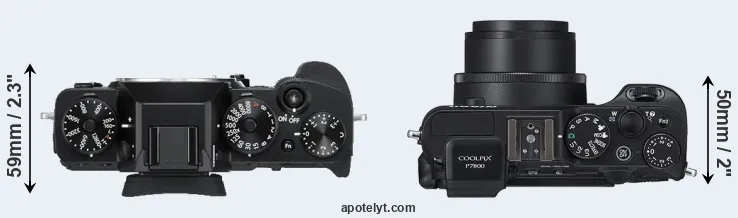 An illustration of the physical size and weight of the Fujifilm X-T3 and the Nikon P7800 is provided in the side-by-side display below. The two cameras are presented according to their relative size. Three successive views from the front, the top, and the rear are shown. All width, height and depth dimensions are rounded to the nearest millimeter.
