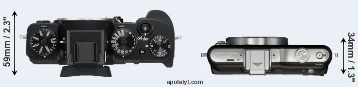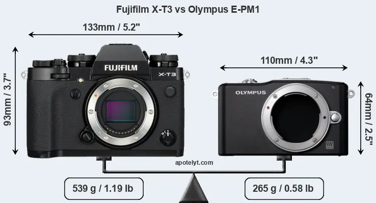 The physical size and weight of the Fujifilm X-T3 and the Olympus E-PM1 are illustrated in the side-by-side display below. The two cameras are presented according to their relative size. Three consecutive perspectives from the front, the top, and the back are available. All width, height and depth dimensions are rounded to the nearest millimeter.
