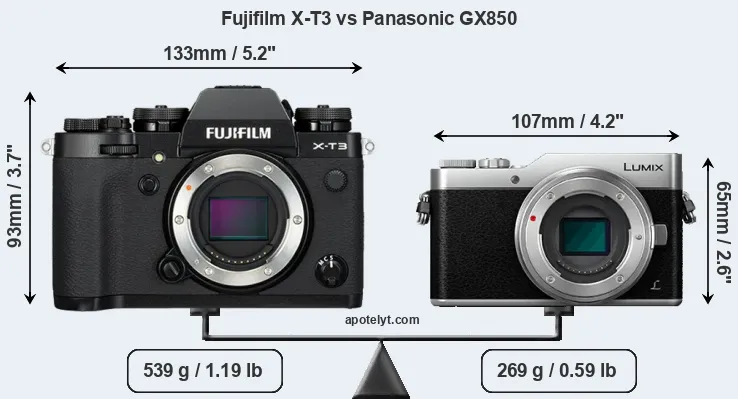 An illustration of the physical size and weight of the Fujifilm X-T3 and the Panasonic GX850 is provided in the side-by-side display below. The two cameras are presented according to their relative size. Three consecutive perspectives from the front, the top, and the back are available. All width, height and depth dimensions are rounded to the nearest millimeter.