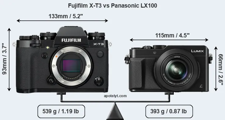 An illustration of the physical size and weight of the Fujifilm X-T3 and the Panasonic LX100 is provided in the side-by-side display below. The two cameras are presented according to their relative size. Three consecutive perspectives from the front, the top, and the back are available. All width, height and depth dimensions are rounded to the nearest millimeter.