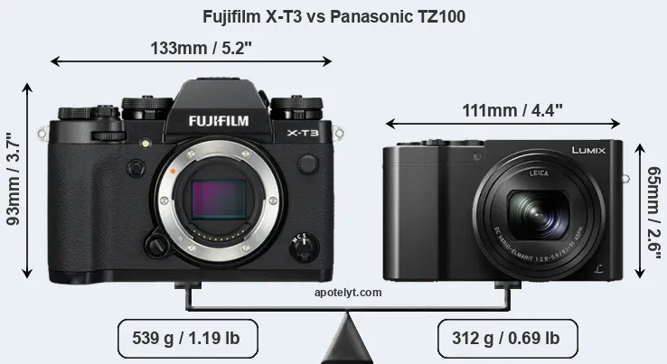 The above size and weight comparisons are to some extent incomplete and possibly misleading, as the TZ100 has a lens built in, whereas the X-T3 is an interchangeable lens camera that requires a separate lens. Attaching the latter will add extra weight and bulk to the setup. You can compare the optics available for the X-T3 and their specifications in the Fujinon X Lens Catalog.