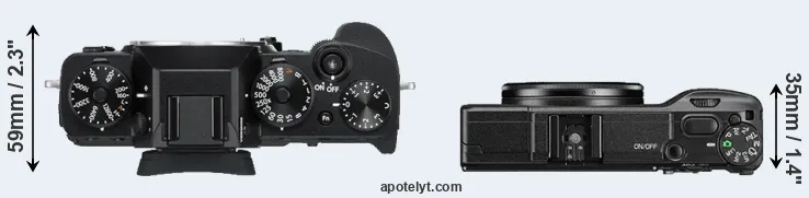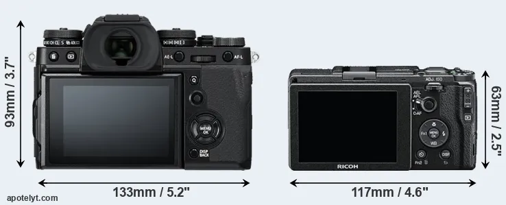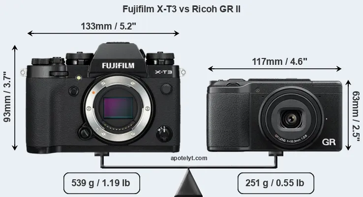 The side-by-side display below illustrates the physical size and weight of the Fujifilm X-T3 and the Ricoh GR II. The two cameras are presented according to their relative size. Three consecutive views from the front, the top, and the rear side are shown. All width, height and depth dimensions are rounded to the nearest millimeter.