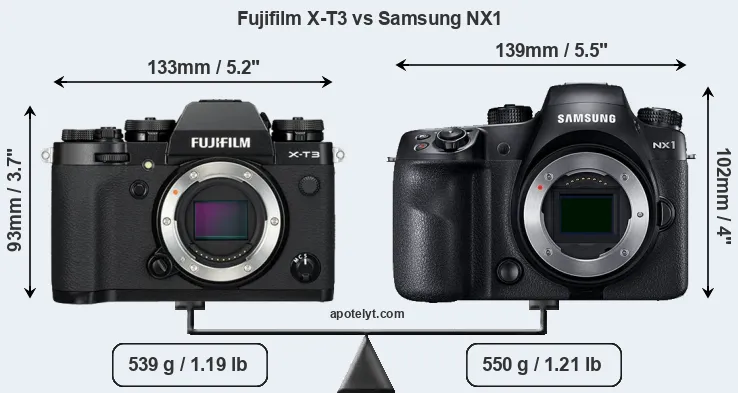 The physical size and weight of the Fujifilm X-T3 and the Samsung NX1 are illustrated in the side-by-side display below. The two cameras are presented according to their relative size. Three consecutive views from the front, the top, and the rear side are shown. All size dimensions are rounded to the nearest millimeter.