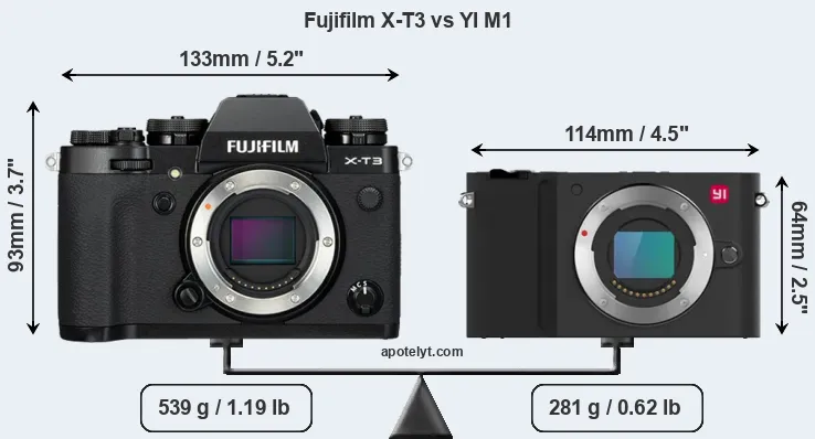 The side-by-side display below illustrates the physical size and weight of the Fujifilm X-T3 and the YI M1. The two cameras are presented according to their relative size. Three consecutive views from the front, the top, and the rear side are shown. All width, height and depth measures are rounded to the nearest millimeter.