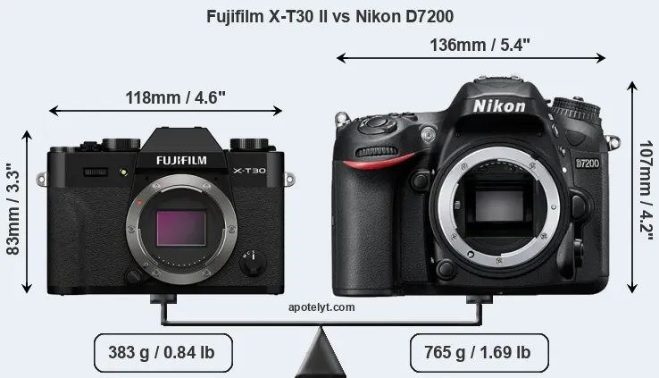 The side-by-side display below illustrates the physical size and weight of the Fujifilm X-T30 II and the Nikon D7200. The two cameras are presented according to their relative size. Three consecutive perspectives from the front, the top, and the back are available. All width, height and depth dimensions are rounded to the nearest millimeter.