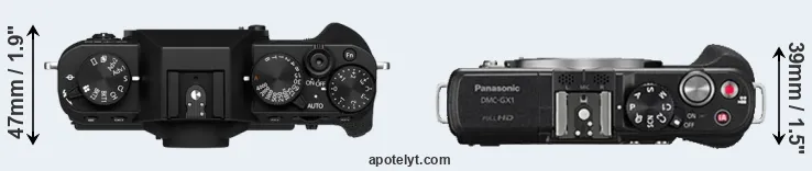 The physical size and weight of the Fujifilm X-T30 II and the Panasonic GX1 are illustrated in the side-by-side display below. The two cameras are presented according to their relative size. Three consecutive perspectives from the front, the top, and the back are available. All width, height and depth dimensions are rounded to the nearest millimeter.