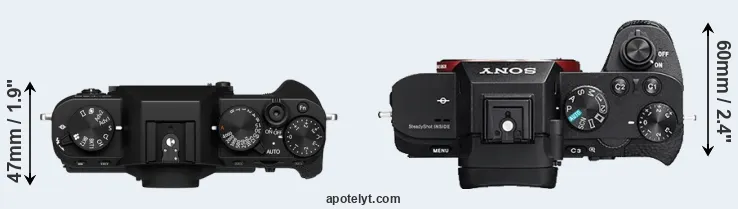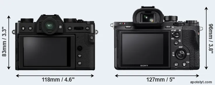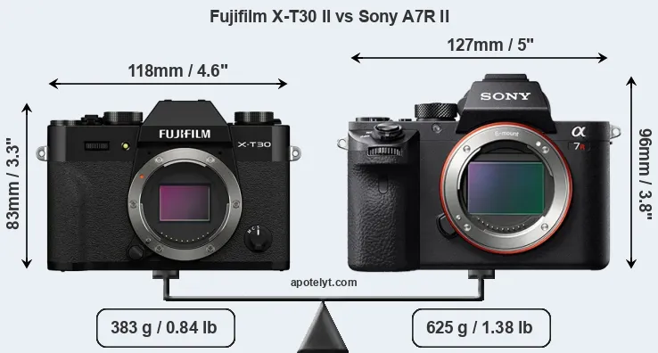 The physical size and weight of the Fujifilm X-T30 II and the Sony A7R II are illustrated in the side-by-side display below. The two cameras are presented according to their relative size. Three consecutive views from the front, the top, and the rear side are shown. All width, height and depth measures are rounded to the nearest millimeter.