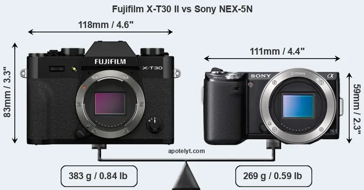 The side-by-side display below illustrates the physical size and weight of the Fujifilm X-T30 II and the Sony NEX-5N. The two cameras are presented according to their relative size. Three consecutive perspectives from the front, the top, and the back are available. All width, height and depth measures are rounded to the nearest millimeter.