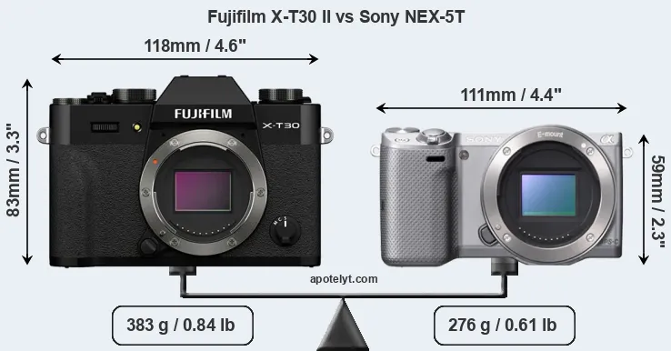 The side-by-side display below illustrates the physical size and weight of the Fujifilm X-T30 II and the Sony NEX-5T. The two cameras are presented according to their relative size. Three consecutive perspectives from the front, the top, and the back are available. All width, height and depth measures are rounded to the nearest millimeter.