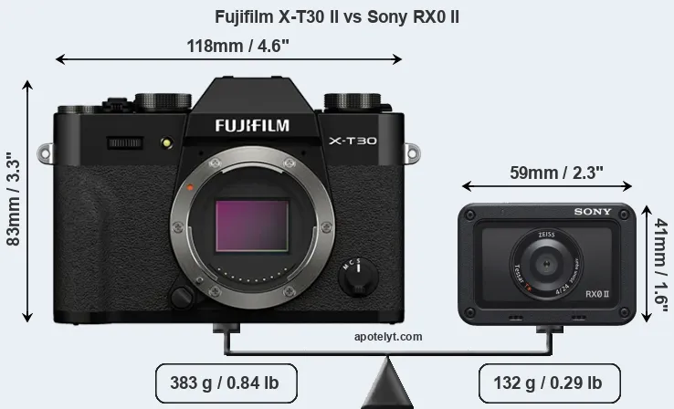 The side-by-side display below illustrates the physical size and weight of the Fujifilm X-T30 II and the Sony RX0 II. The two cameras are presented according to their relative size. Three consecutive perspectives from the front, the top, and the back are available. All width, height and depth dimensions are rounded to the nearest millimeter.