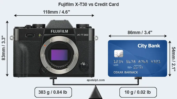 The side-by-side display below illustrates the physical size of the Fujifilm X-T30 vis-à-vis a credit card. Three consecutive views from the front, the top, and the rear side are shown. All width, height and depth measures are rounded to the nearest millimeter.