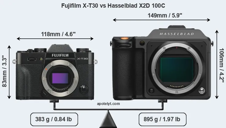 If the front view area (width x height) of the cameras is taken as an aggregate measure of their size, the Hasselblad X2D 100C is considerably larger (61 percent) than the Fujifilm X-T30. Moreover, the X2D 100C is substantially heavier (134 percent) than the X-T30. It is noteworthy in this context that the X2D 100C is splash and dust-proof, while the X-T30 does not feature any corresponding weather-sealing.