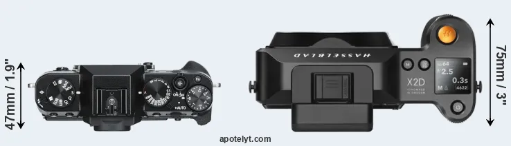 The physical size and weight of the Fujifilm X-T30 and the Hasselblad X2D 100C are illustrated in the side-by-side display below. The two cameras are presented according to their relative size. Three consecutive perspectives from the front, the top, and the back are available. All size dimensions are rounded to the nearest millimeter.