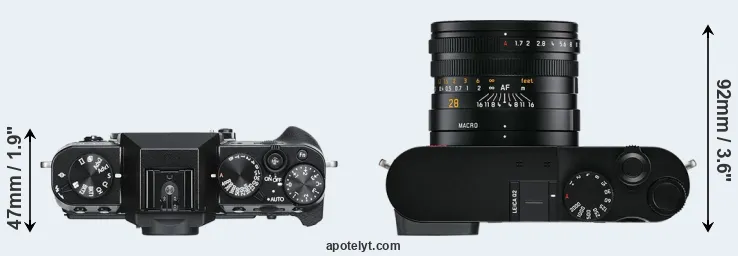 The side-by-side display below illustrates the physical size and weight of the Fujifilm X-T30 and the Leica Q2. The two cameras are presented according to their relative size. Three consecutive perspectives from the front, the top, and the back are available. All width, height and depth measures are rounded to the nearest millimeter.