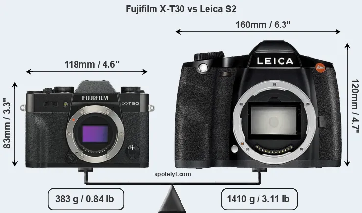 If the front view area (width x height) of the cameras is taken as an aggregate measure of their size, the Leica S2 is considerably larger (96 percent) than the Fujifilm X-T30. Moreover, the S2 is substantially heavier (268 percent) than the X-T30. It is noteworthy in this context that the S2 is splash and dust-proof, while the X-T30 does not feature any corresponding weather-sealing.