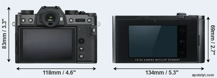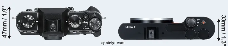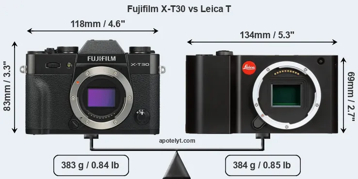 The side-by-side display below illustrates the physical size and weight of the Fujifilm X-T30 and the Leica T. The two cameras are presented according to their relative size. Three consecutive perspectives from the front, the top, and the back are available. All width, height and depth measures are rounded to the nearest millimeter.
