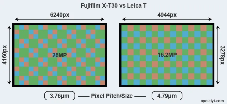 Despite having a slightly smaller sensor, the Fujifilm X-T30 offers a higher resolution of 26 megapixels, compared with 16.2 MP of the Leica T. This megapixels advantage comes at the cost of a higher pixel density and a smaller size of the individual pixel (with a pixel pitch of 3.76μm versus 4.79μm for the T Typ 701). However, it should be noted that the X-T30 is much more recent (by 4 years and 9 months) than the T Typ 701, and its sensor will have benefitted from technological advances during this time that make it possible to gather light more efficiently. Coming back to sensor resolution, it should be mentioned that neither of the two cameras has an anti-alias filter installed, so they are able to capture all the detail the sensor resolves.