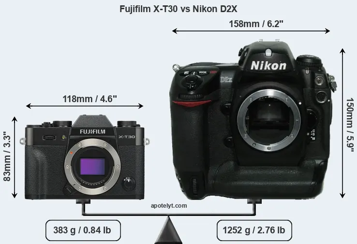 If the front view area (width x height) of the cameras is taken as an aggregate measure of their size, the Nikon D2X is considerably larger (142 percent) than the Fujifilm X-T30. Moreover, the D2X is substantially heavier (227 percent) than the X-T30. It is noteworthy in this context that the D2X is splash and dust-proof, while the X-T30 does not feature any corresponding weather-sealing.
