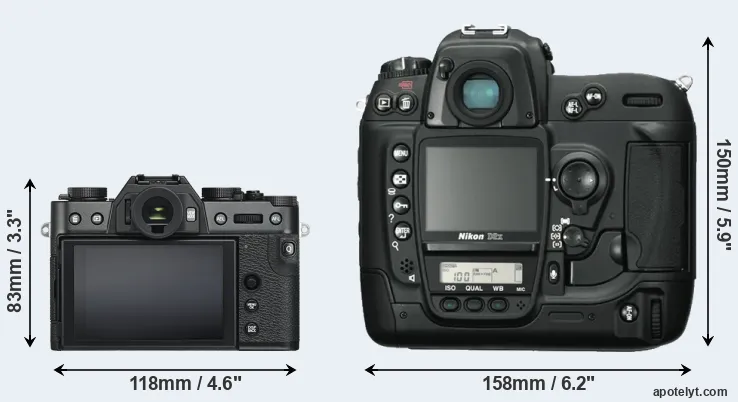 The above size and weight comparisons are to some extent incomplete since they do not consider the interchangeable lenses that both of these cameras require. Both cameras have similarly sized sensors, but DSLRs have a larger flange-to-focal plane distance than mirrorless cameras, which imposes contraints on the optical engineering process and generally leads to bigger and heavier lenses. You can compare the optics available for the two cameras in the Fujinon X Lens Catalog (X-T30) and the Nikon Lens Catalog (D2X). Mirrorless cameras, such as the Fujifilm X-T30, have moreover the advantage that they have a relatively short flange to focal plane distance and can thus use many lenses from other systems via adapters.