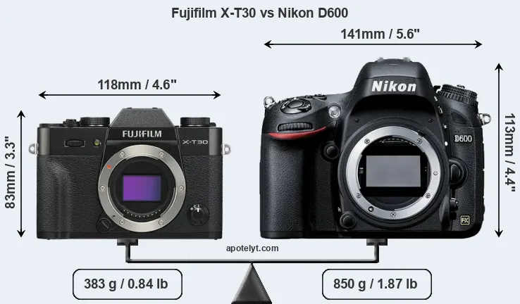 If the front view area (width x height) of the cameras is taken as an aggregate measure of their size, the Nikon D600 is considerably larger (63 percent) than the Fujifilm X-T30. Moreover, the D600 is substantially heavier (122 percent) than the X-T30. It is noteworthy in this context that the D600 is splash and dust-proof, while the X-T30 does not feature any corresponding weather-sealing.