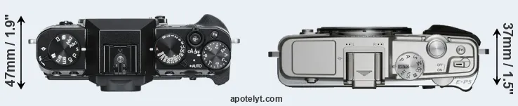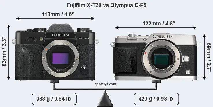 The side-by-side display below illustrates the physical size and weight of the Fujifilm X-T30 and the Olympus E-P5. The two cameras are presented according to their relative size. Three consecutive perspectives from the front, the top, and the back are available. All width, height and depth measures are rounded to the nearest millimeter.