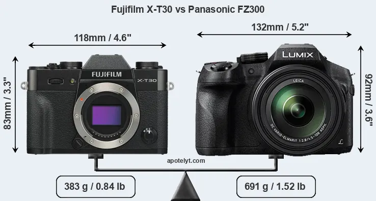 An illustration of the physical size and weight of the Fujifilm X-T30 and the Panasonic FZ300 is provided in the side-by-side display below. The two cameras are presented according to their relative size. Three consecutive views from the front, the top, and the rear side are shown. All width, height and depth dimensions are rounded to the nearest millimeter.