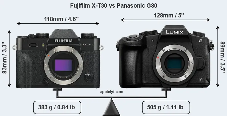 If the front view area (width x height) of the cameras is taken as an aggregate measure of their size, the Panasonic G80 is notably larger (16 percent) than the Fujifilm X-T30. Moreover, the G80 is markedly heavier (32 percent) than the X-T30. It is noteworthy in this context that the G80 is splash and dust-proof, while the X-T30 does not feature any corresponding weather-sealing.