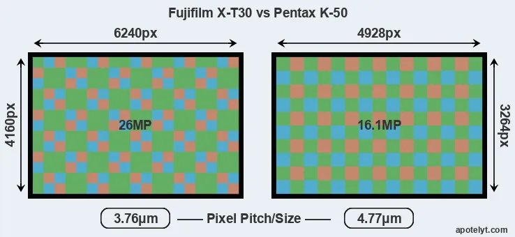 | Sensor Specs | Fujifilm X-T30 | Pentax K-50 |