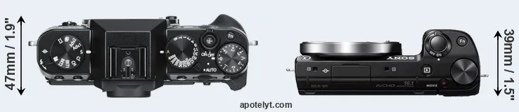 The side-by-side display below illustrates the physical size and weight of the Fujifilm X-T30 and the Sony NEX-5R. The two cameras are presented according to their relative size. Three consecutive views from the front, the top, and the rear side are shown. All width, height and depth measures are rounded to the nearest millimeter.
