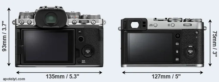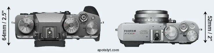 The physical size and weight of the Fujifilm X-T4 and the Fujifilm X100F are illustrated in the side-by-side display below. The two cameras are presented according to their relative size. Three consecutive views from the front, the top, and the rear side are shown. All width, height and depth dimensions are rounded to the nearest millimeter.