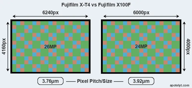 Despite having a slightly smaller sensor, the Fujifilm X-T4 offers a higher resolution of 26 megapixels, compared with 24 MP of the Fujifilm X100F. This megapixels advantage comes at the cost of a higher pixel density and a smaller size of the individual pixel (with a pixel pitch of 3.76μm versus 3.92μm for the X100F). However, it should be noted that the X-T4 is much more recent (by 3 years and 1 month) than the X100F, and its sensor will have benefitted from technological advances during this time that make it possible to gather light more efficiently. Coming back to sensor resolution, it should be mentioned that neither of the two cameras has an anti-alias filter installed, so they are able to capture all the detail the sensor resolves.