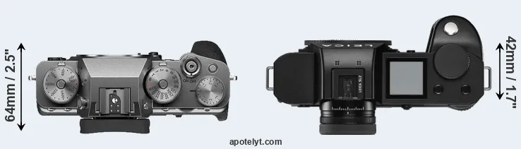 The physical size and weight of the Fujifilm X-T4 and the Leica SL2 are illustrated in the side-by-side display below. The two cameras are presented according to their relative size. Three successive views from the front, the top, and the rear are shown. All width, height and depth measures are rounded to the nearest millimeter.
