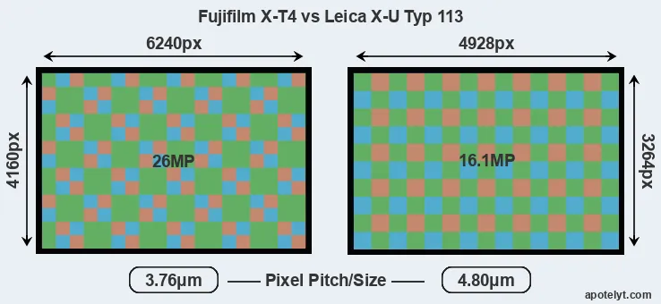 Despite having a slightly smaller sensor, the Fujifilm X-T4 offers a higher resolution of 26 megapixels, compared with 16.1 MP of the Leica X-U Typ 113. This megapixels advantage comes at the cost of a higher pixel density and a smaller size of the individual pixel (with a pixel pitch of 3.76μm versus 4.80μm for the X-U Typ 113). However, it should be noted that the X-T4 is much more recent (by 4 years and 1 month) than the X-U Typ 113, and its sensor will have benefitted from technological advances during this time that make it possible to gather light more efficiently. Coming back to sensor resolution, it should be mentioned that the X-T4 has no anti-alias filter installed, so that it can capture all the detail its sensor resolves.