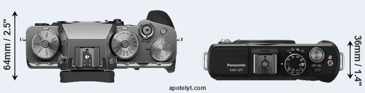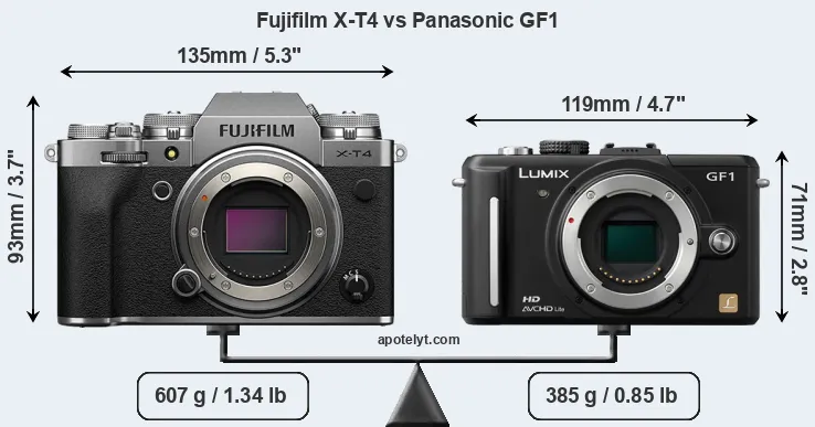 An illustration of the physical size and weight of the Fujifilm X-T4 and the Panasonic GF1 is provided in the side-by-side display below. The two cameras are presented according to their relative size. Three consecutive perspectives from the front, the top, and the back are available. All size dimensions are rounded to the nearest millimeter.