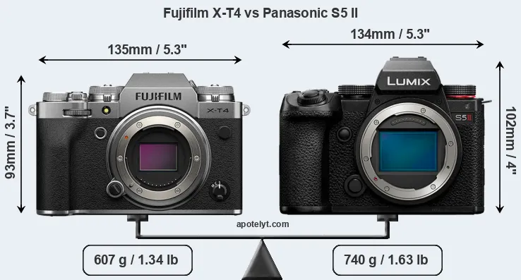 The side-by-side display below illustrates the physical size and weight of the Fujifilm X-T4 and the Panasonic S5 II. The two cameras are presented according to their relative size. Three successive views from the front, the top, and the rear are shown. All width, height and depth dimensions are rounded to the nearest millimeter.